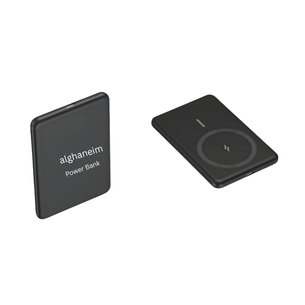 Crafted with an insulated, environment-friendly body that produces no static charge, this power bank offers safe, reliable performance. Ideal as a premium business gift, it features a glowing Alghaneim brand logo, adding a modern and stylish look.